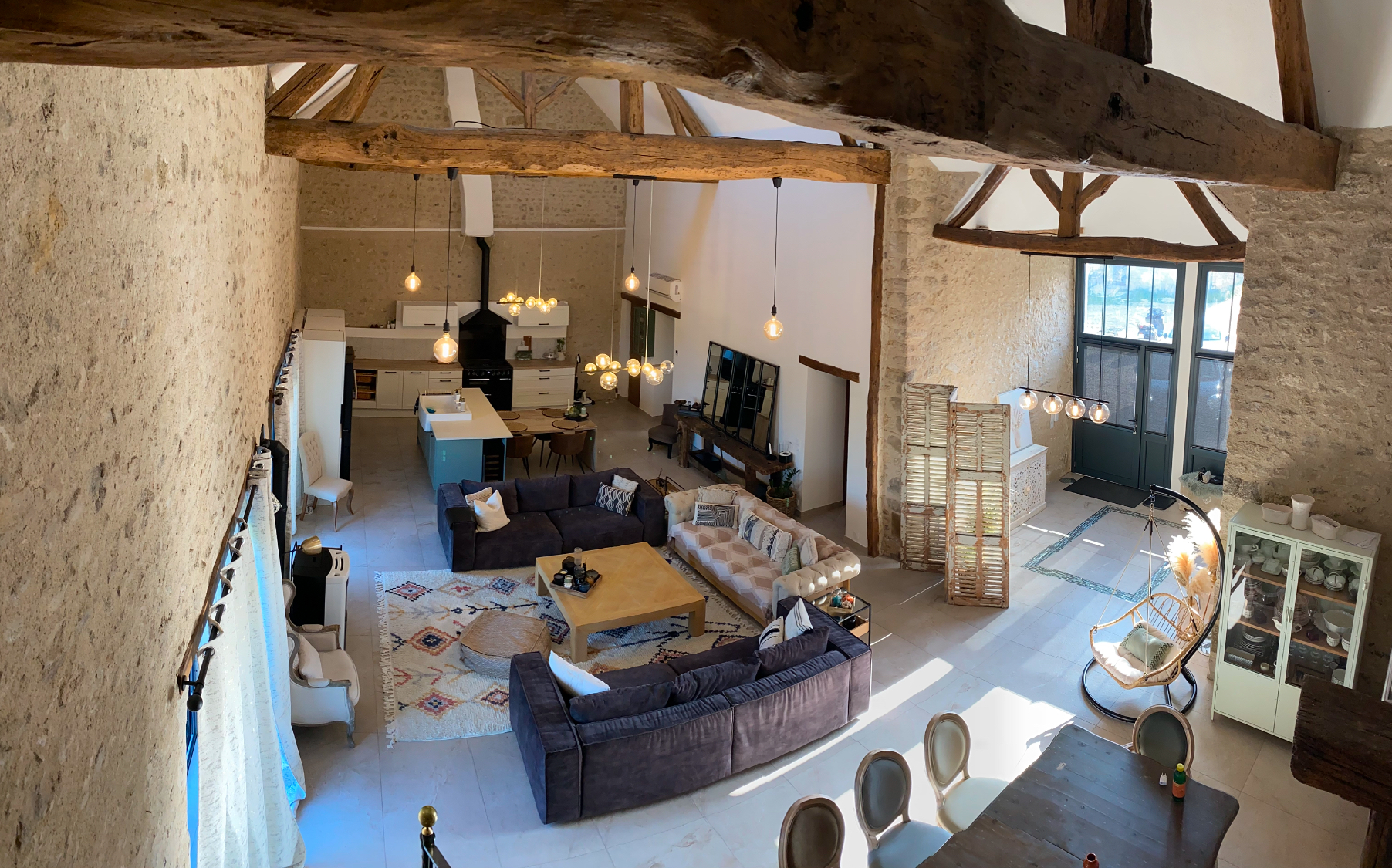 LES TOMETTES ET LES POUTRES CENTENAIRES AVEC UN TOIT CATHEDRALE DE 7 METRES DE HAUT VOUS LAISSE SANS VOIX SA GRANDE CHEMINEE CENTRALE PERMET DES FLAMBEES CONVIVIALES OU D’AGREMENT UN ENSOLEILLEMENT TRAVERSANT DONNE A CETTE PIECE UNE LUMINOSITE INCOMPARABLE AVEC DE GRANDS VELUX SOUS LA TOITURE