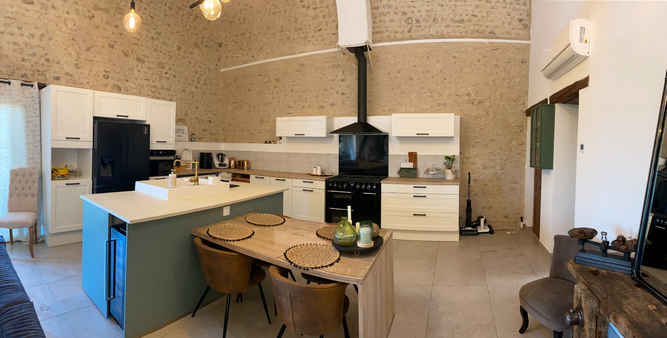 UNE CUISINE PANORAMIQUE CATHÉDRALE DE 20 M2, MEUBLÉE ET ÉQUIPÉE AVEC SORTIES SUR LA TERRASSE EN BOIS ET LE JARDIN ;