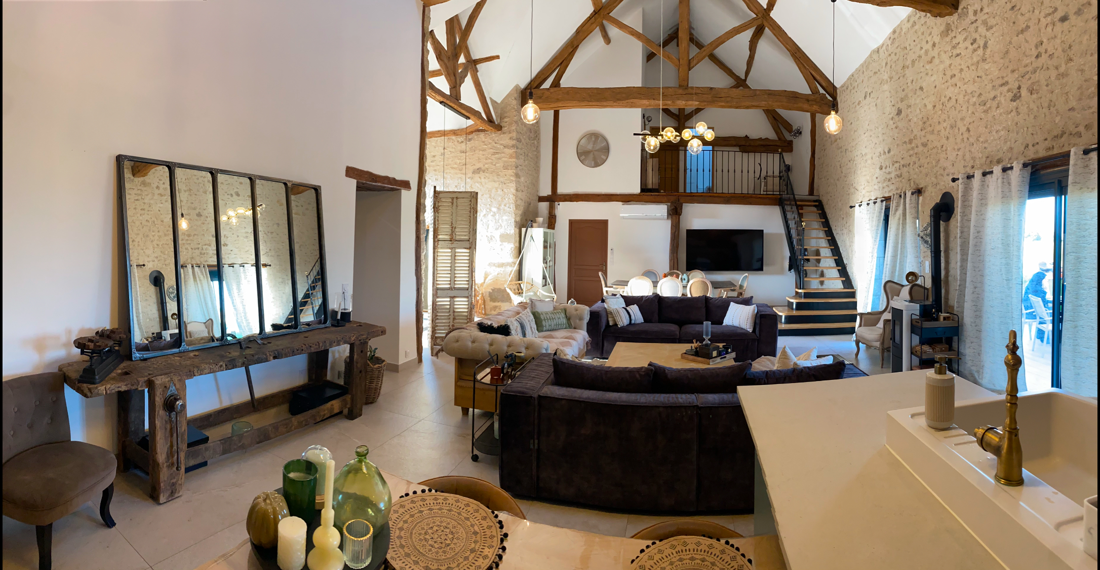 UNE PIÈCE DE VIE DE 100 M2 AVEC CHEMINÉE TAILLÉE DANS LA PIERRE DONNANT SUR UNE TERRASSE DE 50 M2